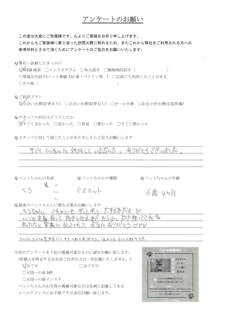 HOME > 訪問実績 > 新潟県長岡市 くぅちゃんの葬儀 2025/09/22 更新日:2025年9月29日 新潟県でペット葬儀を行っている「天国への扉」です。 この度は、新潟県長岡市のくぅちゃんの葬儀を行いました。 心よりご冥福をお祈り致します。 天国への扉は長岡市を中心に、完全個別火葬を行っているペット葬儀屋です。新潟県内全域に対応しております。ぜひあなたも天国への扉で愛するご家族を見送りませんか? 「ペットメモリアル新潟長岡」 Twitter Share Pocket Hatena LINE コピーする