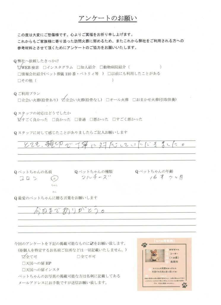 HOME > 訪問実績 > 新潟県柏崎市 コロン君の葬儀 2025/09/26 投稿日:2025年9月26日 新潟県でペット葬儀を行っている「天国への扉」です。 この度は、新潟県柏崎市のコロン君の葬儀を行いました。 心よりご冥福をお祈り致します。 天国への扉は長岡市を中心に、完全個別火葬を行っているペット葬儀屋です。新潟県内全域に対応しております。ぜひあなたも天国への扉で愛するご家族を見送りませんか? 「ペットメモリアル新潟長岡」 Twitter Share Pocket Hatena LINE コピーする