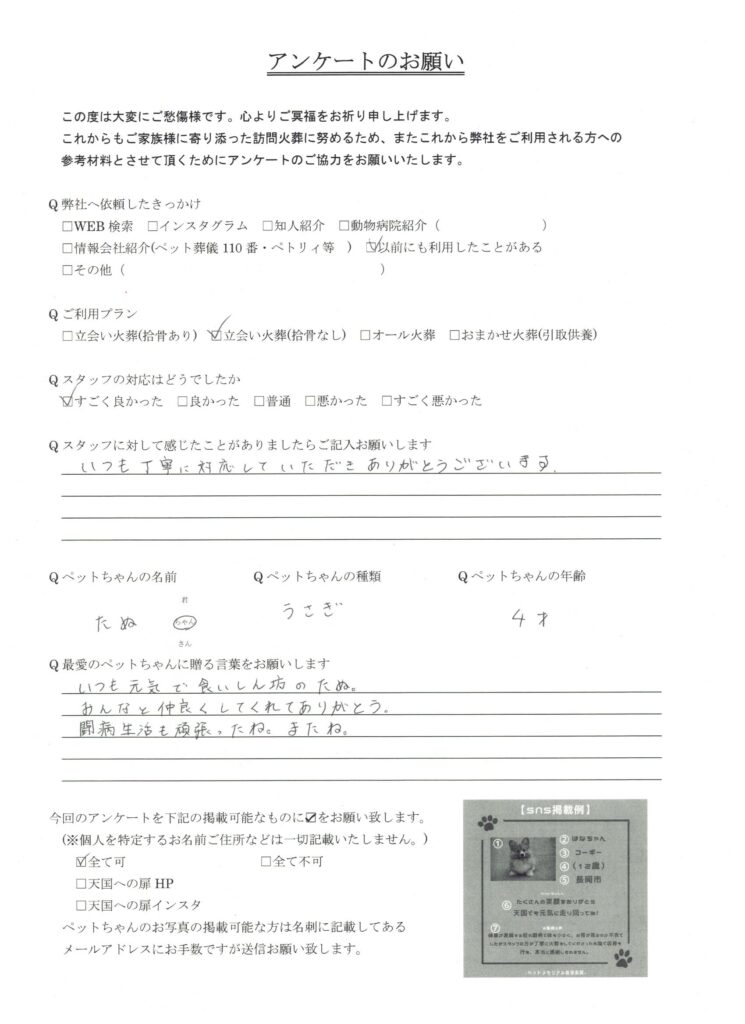 HOME > 訪問実績 > 新潟県長岡市 たぬちゃんの葬儀 2025/10/18 投稿日:2025年10月18日 新潟県でペット葬儀を行っている「天国への扉」です。 この度は、新潟県長岡市のたぬちゃんの葬儀を行いました。 心よりご冥福をお祈り致します。 天国への扉は長岡市を中心に、完全個別火葬を行っているペット葬儀屋です。新潟県内全域に対応しております。ぜひあなたも天国への扉で愛するご家族を見送りませんか? 「ペットメモリアル新潟長岡」 Twitter Share Pocket Hatena LINE コピーする