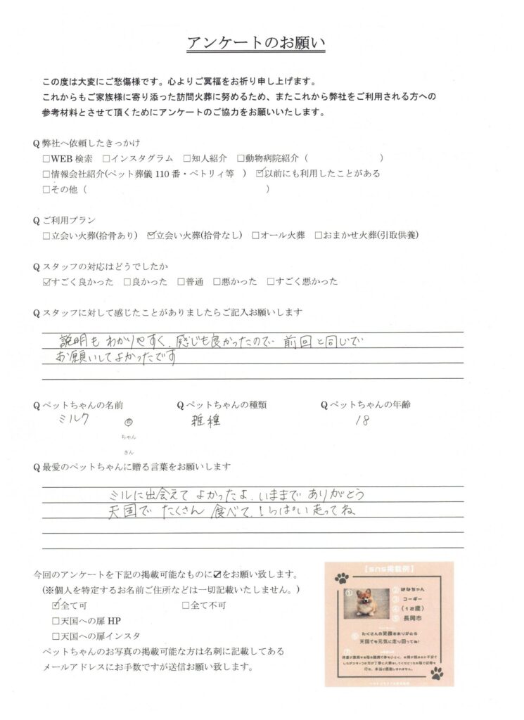 HOME > 訪問実績 > 新潟県長岡市 ミルク君の葬儀 2025/11/13 投稿日:2025年11月13日 新潟県でペット葬儀を行っている「天国への扉」です。 この度は、新潟県長岡市のミルク君の葬儀を行いました。 心よりご冥福をお祈り致します。 天国への扉は長岡市を中心に、完全個別火葬を行っているペット葬儀屋です。新潟県内全域に対応しております。ぜひあなたも天国への扉で愛するご家族を見送りませんか? 「ペットメモリアル新潟長岡」 Twitter Share Pocket Hatena LINE コピーする