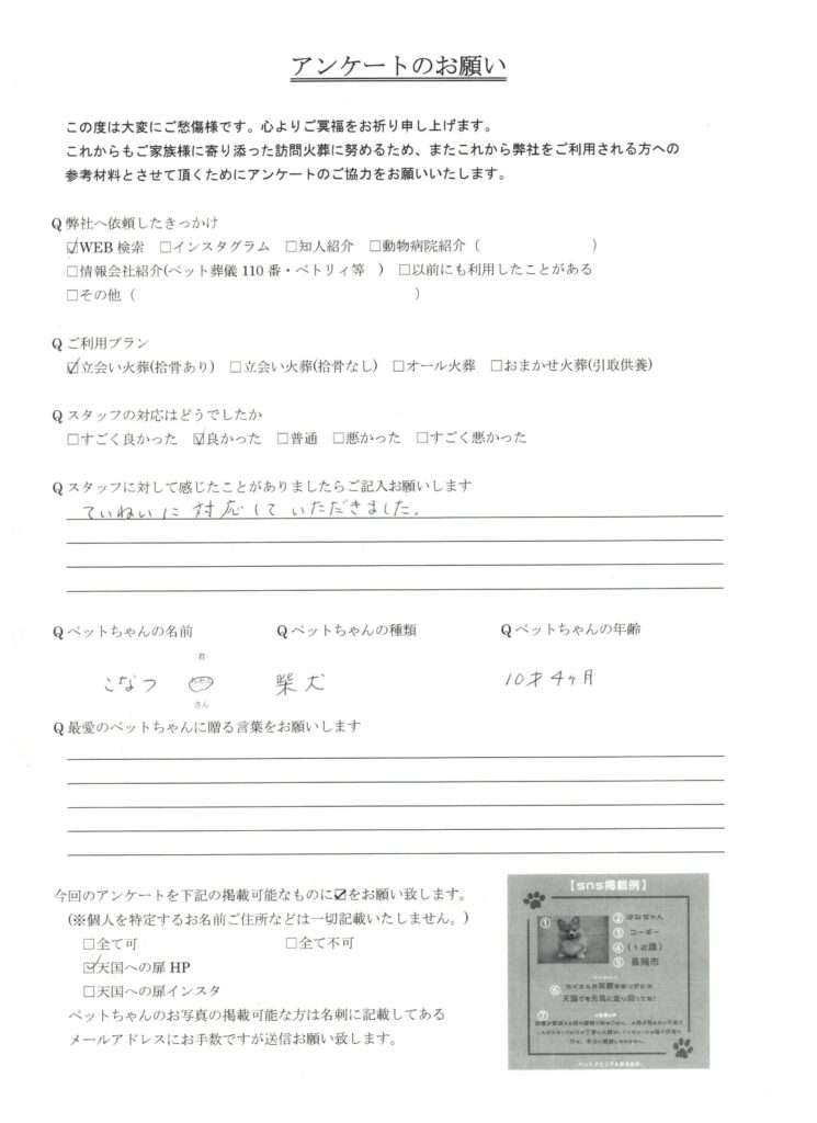 HOME > 訪問実績 > 新潟県長岡市 こなつちゃんの葬儀 2025/11/26 投稿日:2025年11月26日 新潟県でペット葬儀を行っている「天国への扉」です。 この度は、新潟県長岡市のこなつちゃんの葬儀を行いました。 心よりご冥福をお祈り致します。 天国への扉は長岡市を中心に、完全個別火葬を行っているペット葬儀屋です。新潟県内全域に対応しております。ぜひあなたも天国への扉で愛するご家族を見送りませんか? 「ペットメモリアル新潟長岡」 Twitter Share Pocket Hatena LINE コピーする