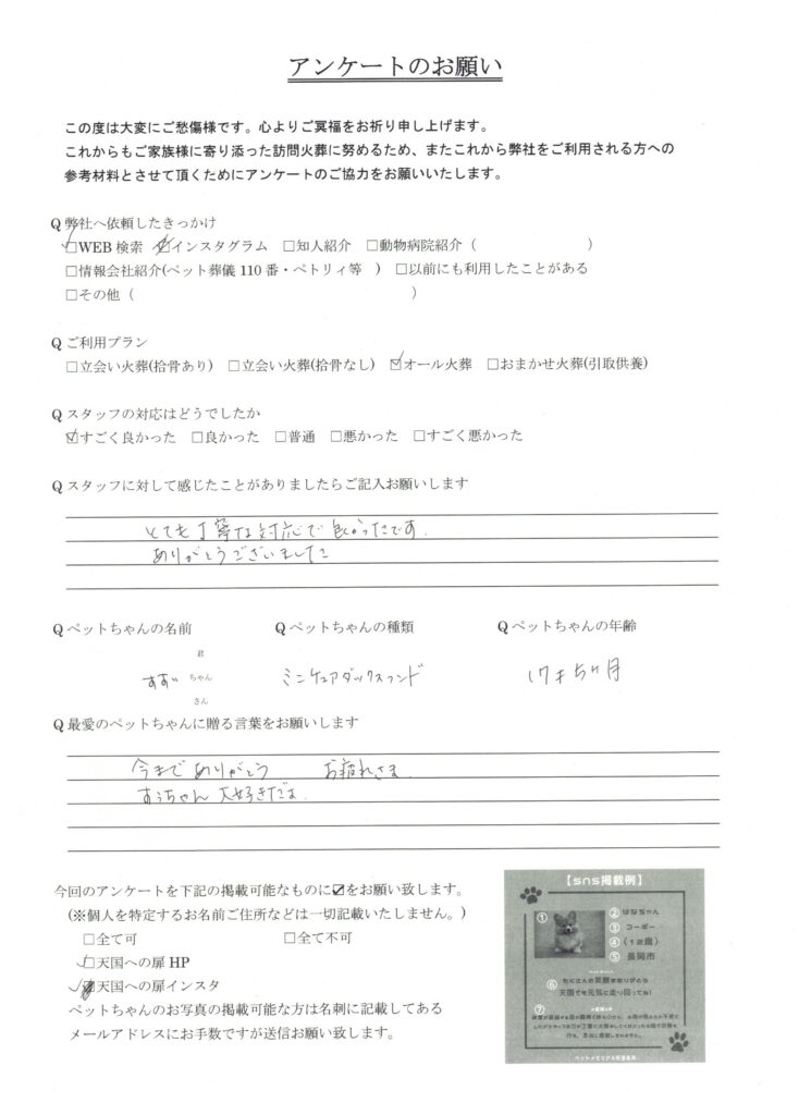 HOME > 訪問実績 > 新潟県長岡市 すずちゃんの葬儀 2025/12/13 投稿日:2025年12月13日 新潟県でペット葬儀を行っている「天国への扉」です。 この度は、新潟県長岡市のすずちゃんの葬儀を行いました。 心よりご冥福をお祈り致します。 天国への扉は長岡市を中心に、完全個別火葬を行っているペット葬儀屋です。新潟県内全域に対応しております。ぜひあなたも天国への扉で愛するご家族を見送りませんか? 「ペットメモリアル新潟長岡」 Twitter Share Pocket Hatena LINE コピーする