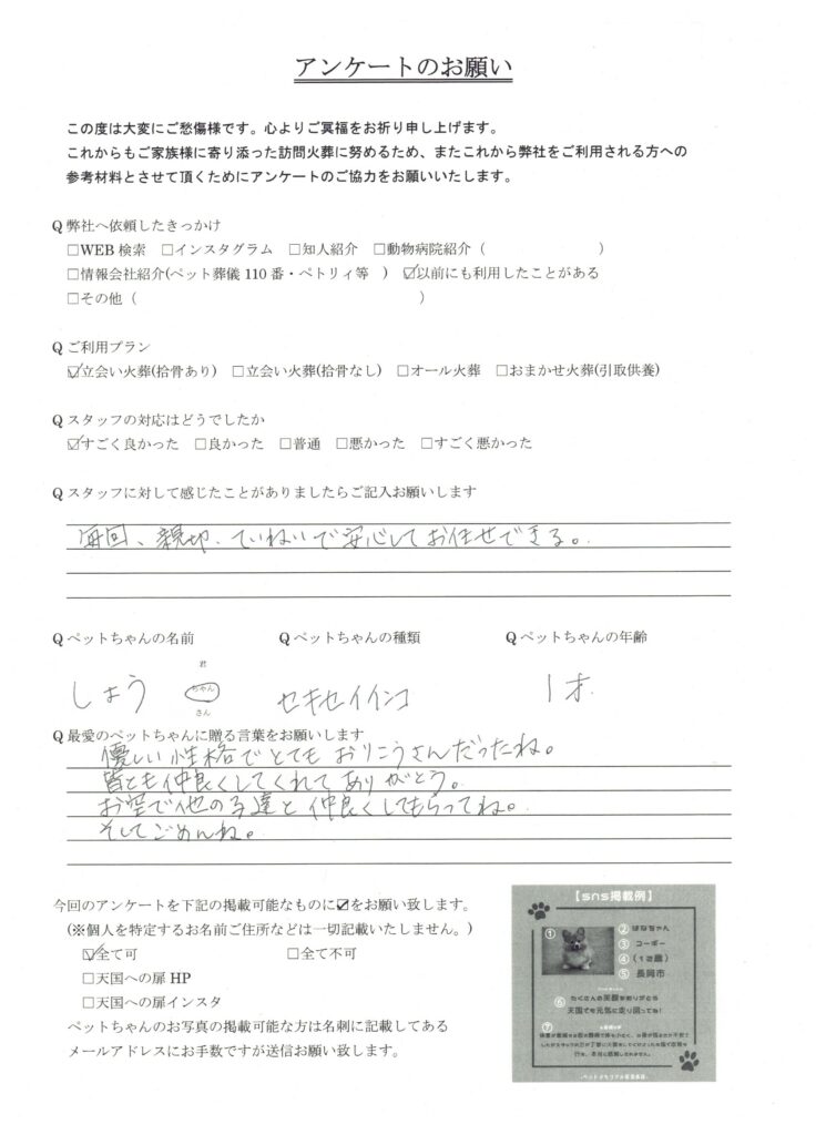HOME > 訪問実績 > 新潟県長岡市 しょうちゃんの葬儀 2025/12/26 投稿日:2025年12月26日 新潟県でペット葬儀を行っている「天国への扉」です。 この度は、新潟県長岡市のしょうちゃんの葬儀を行いました。 心よりご冥福をお祈り致します。 天国への扉は長岡市を中心に、完全個別火葬を行っているペット葬儀屋です。新潟県内全域に対応しております。ぜひあなたも天国への扉で愛するご家族を見送りませんか? 「ペットメモリアル新潟長岡」 Twitter Share Pocket Hatena LINE コピーする