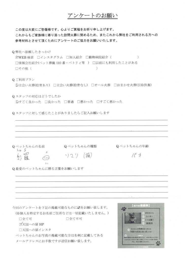 HOME > 訪問実績 > 新潟県燕市 紗羅(シャラ)ちゃんの葬儀 2026/01/16 投稿日:2026年1月17日 新潟県でペット葬儀を行っている「天国への扉」です。 この度は、新潟県燕市の紗羅ちゃんの葬儀を行いました。 心よりご冥福をお祈り致します。 天国への扉は長岡市を中心に、完全個別火葬を行っているペット葬儀屋です。新潟県内全域に対応しております。ぜひあなたも天国への扉で愛するご家族を見送りませんか? 「ペットメモリアル新潟長岡」 Twitter Share Pocket Hatena LINE コピーする