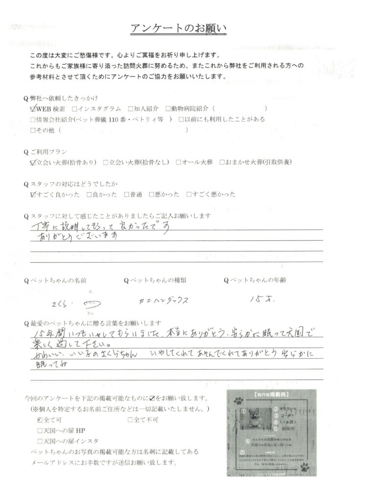 HOME > 訪問実績 > 新潟県長岡市 さくらちゃんの葬儀 2026/01/20 投稿日:2026年1月20日 新潟県でペット葬儀を行っている「天国への扉」です。 この度は、新潟県長岡市のさくらちゃんの葬儀を行いました。 心よりご冥福をお祈り致します。 天国への扉は長岡市を中心に、完全個別火葬を行っているペット葬儀屋です。新潟県内全域に対応しております。ぜひあなたも天国への扉で愛するご家族を見送りませんか? 「ペットメモリアル新潟長岡」 Twitter Share Pocket Hatena LINE コピーする