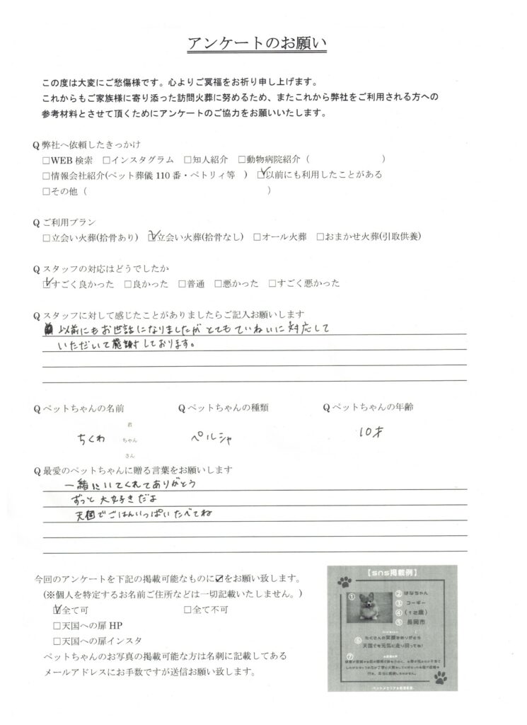 HOME > 訪問実績 > 新潟県新潟市 ちくわちゃんの葬儀 2026/02/04 投稿日:2026年2月4日 新潟県でペット葬儀を行っている「天国への扉」です。 この度は、新潟県新潟市のちくわちゃんの葬儀を行いました。 心よりご冥福をお祈り致します。 天国への扉は長岡市を中心に、完全個別火葬を行っているペット葬儀屋です。新潟県内全域に対応しております。ぜひあなたも天国への扉で愛するご家族を見送りませんか? 「ペットメモリアル新潟長岡」 Twitter Share Pocket Hatena LINE コピーする