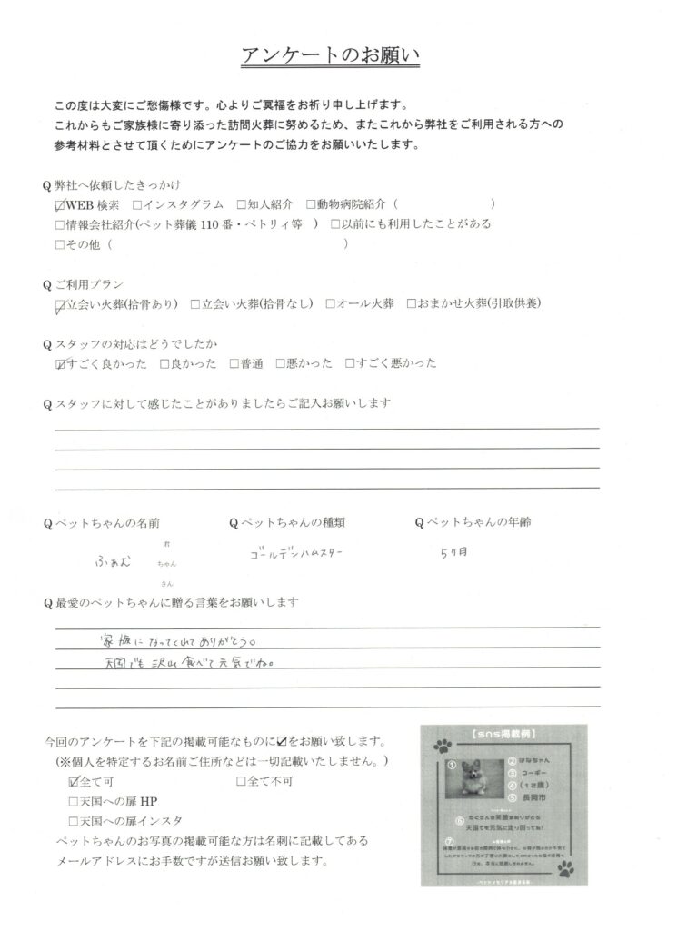 HOME > 訪問実績 > 新潟県長岡市 ふぁむちゃんの葬儀 2026/02/07 投稿日:2026年2月7日 新潟県でペット葬儀を行っている「天国への扉」です。 この度は、新潟県長岡市のふぁむちゃんの葬儀を行いました。 心よりご冥福をお祈り致します。 天国への扉は長岡市を中心に、完全個別火葬を行っているペット葬儀屋です。新潟県内全域に対応しております。ぜひあなたも天国への扉で愛するご家族を見送りませんか? 「ペットメモリアル新潟長岡」 Twitter Share Pocket Hatena LINE コピーする