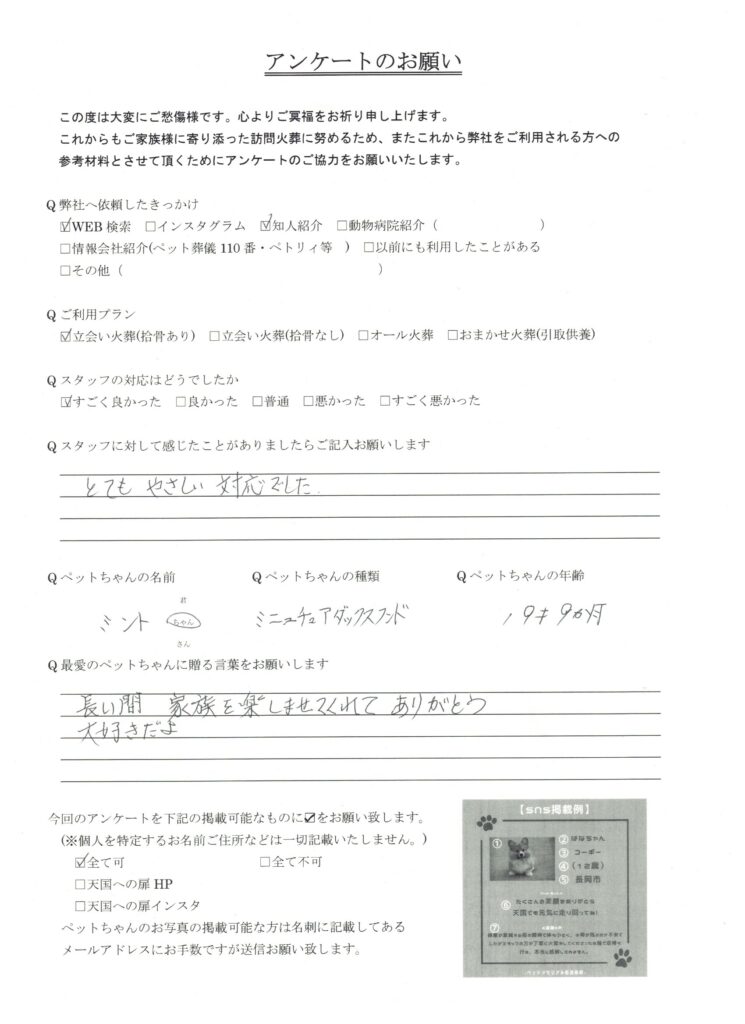HOME > 訪問実績 > 新潟県長岡市 ミントちゃんの葬儀 2026/02/07 更新日:2026年2月9日 新潟県でペット葬儀を行っている「天国への扉」です。 この度は、新潟県長岡市のミントちゃんの葬儀を行いました。 心よりご冥福をお祈り致します。 天国への扉は長岡市を中心に、完全個別火葬を行っているペット葬儀屋です。新潟県内全域に対応しております。ぜひあなたも天国への扉で愛するご家族を見送りませんか? 「ペットメモリアル新潟長岡」 Twitter Share Pocket Hatena LINE コピーする