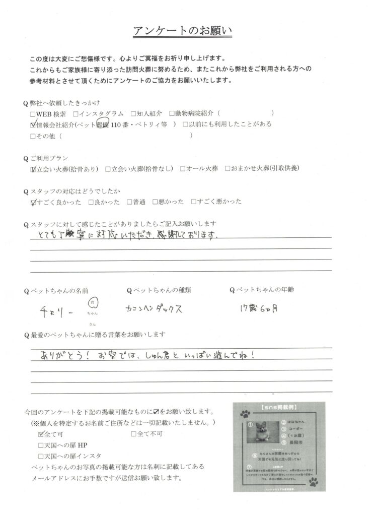 HOME > 訪問実績 > 新潟県弥彦村 チェリー君の葬儀 2026/02/12 投稿日:2026年2月12日 新潟県でペット葬儀を行っている「天国への扉」です。 この度は、新潟県弥彦村のチェリー君の葬儀を行いました。 心よりご冥福をお祈り致します。 天国への扉は長岡市を中心に、完全個別火葬を行っているペット葬儀屋です。新潟県内全域に対応しております。ぜひあなたも天国への扉で愛するご家族を見送りませんか? 「ペットメモリアル新潟長岡」 Twitter Share Pocket Hatena LINE コピーする