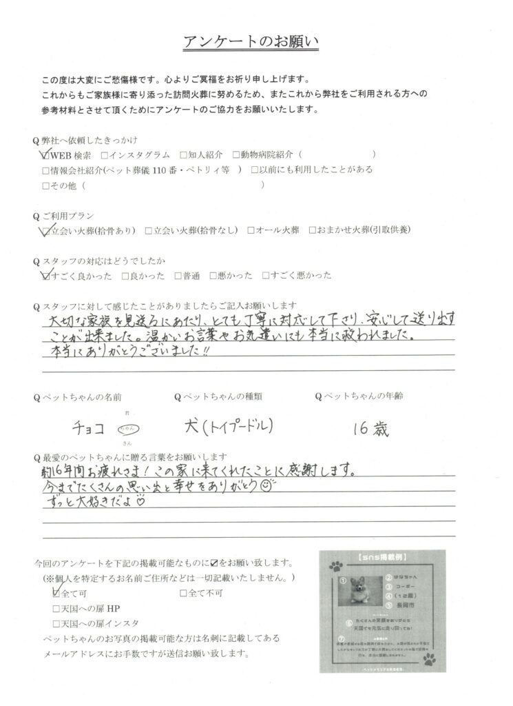 HOME > 訪問実績 > 新潟県柏崎市 チョコちゃんの葬儀 2026/03/08 投稿日:2026年3月8日 新潟県でペット葬儀を行っている「天国への扉」です。 この度は、新潟県柏崎市のチョコちゃんの葬儀を行いました。 心よりご冥福をお祈り致します。 天国への扉は長岡市を中心に、完全個別火葬を行っているペット葬儀屋です。新潟県内全域に対応しております。ぜひあなたも天国への扉で愛するご家族を見送りませんか? 「ペットメモリアル新潟長岡」 Twitter Share Pocket Hatena LINE コピーする