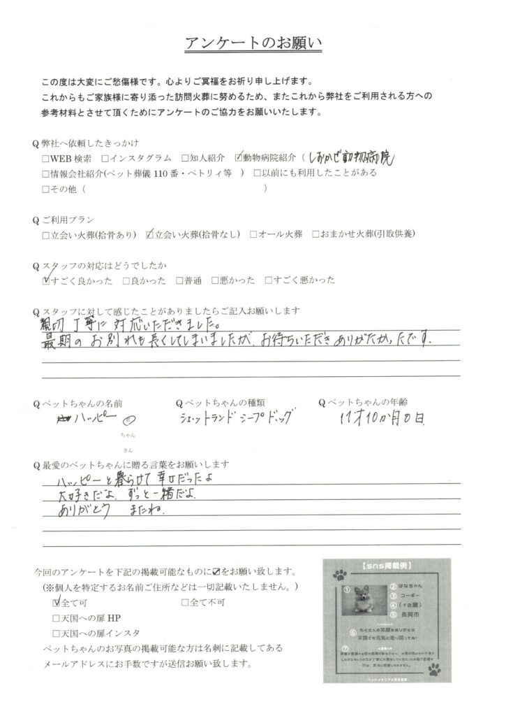 この度は、新潟県柏崎市のハッピー君の葬儀を行いました。