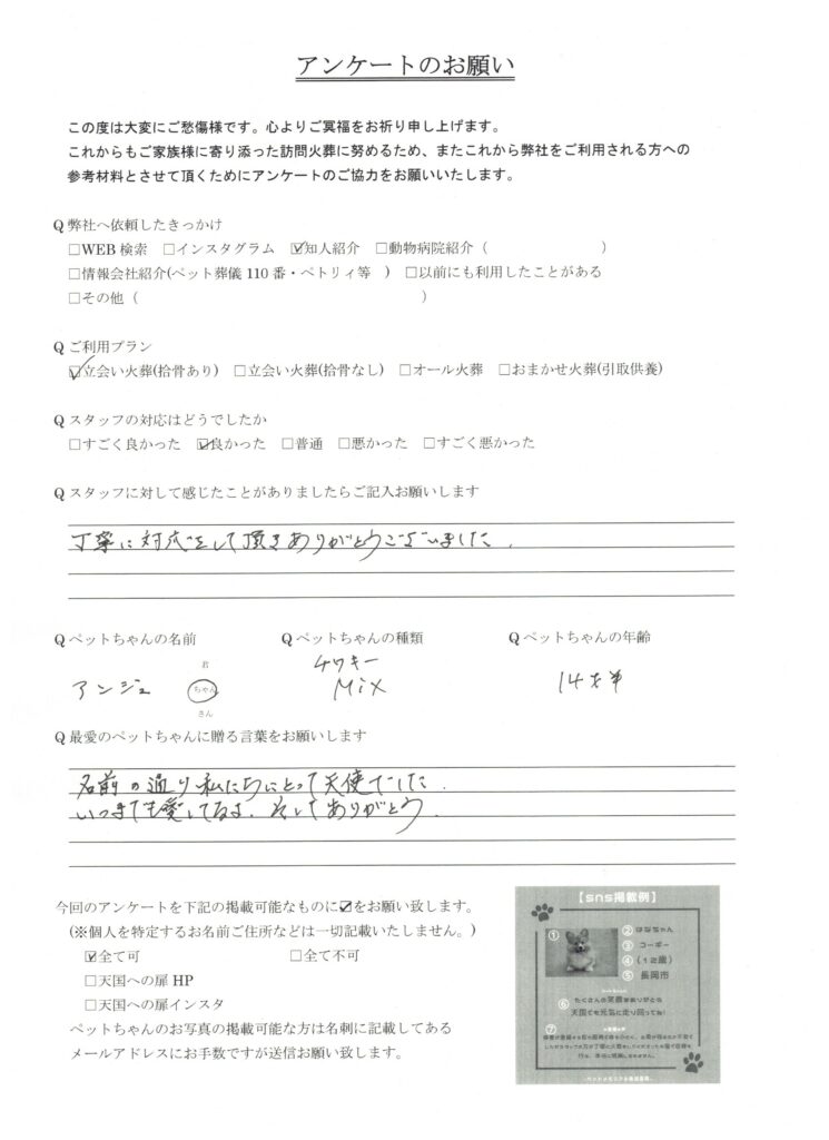 HOME > 訪問実績 > 新潟県長岡市 アンジュちゃんの葬儀 2026/03/18 投稿日:2026年3月18日 新潟県でペット葬儀を行っている「天国への扉」です。 この度は、新潟県長岡市のアンジュちゃんの葬儀を行いました。 心よりご冥福をお祈り致します。 天国への扉は長岡市を中心に、完全個別火葬を行っているペット葬儀屋です。新潟県内全域に対応しております。ぜひあなたも天国への扉で愛するご家族を見送りませんか? 「ペットメモリアル新潟長岡」 Twitter Share Pocket Hatena LINE コピーする