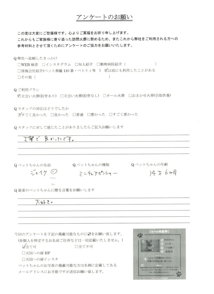 この度は、新潟県柏崎市のジェイク君の葬儀を行いました。