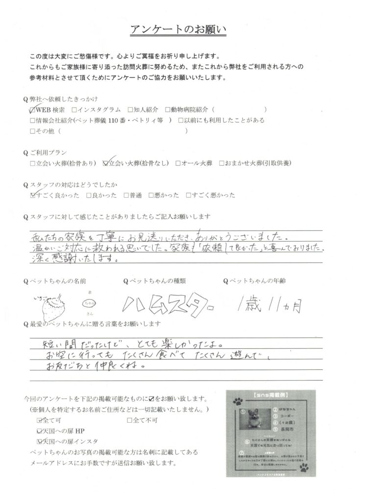 HOME > 訪問実績 > 新潟県長岡市 いちごちゃんの葬儀 2026/04/09 投稿日:2026年4月9日 新潟県でペット葬儀を行っている「天国への扉」です。 この度は、新潟県長岡市のいちごちゃんの葬儀を行いました。 心よりご冥福をお祈り致します。 天国への扉は長岡市を中心に、完全個別火葬を行っているペット葬儀屋です。新潟県内全域に対応しております。ぜひあなたも天国への扉で愛するご家族を見送りませんか? 「ペットメモリアル新潟長岡」 Twitter Share Pocket Hatena LINE コピーする