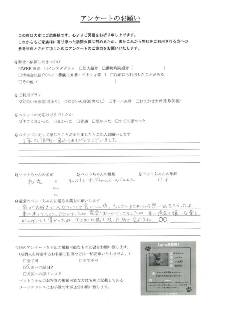 HOME > 訪問実績 > 新潟県小千谷市 紅丸(べにまる)君の葬儀 2026/04/18 投稿日:2026年4月18日 新潟県でペット葬儀を行っている「天国への扉」です。 この度は、新潟県小千谷市の紅丸君の葬儀を行いました。 心よりご冥福をお祈り致します。 天国への扉は長岡市を中心に、完全個別火葬を行っているペット葬儀屋です。新潟県内全域に対応しております。ぜひあなたも天国への扉で愛するご家族を見送りませんか? 「ペットメモリアル新潟長岡」 Twitter Share Pocket Hatena LINE コピーする