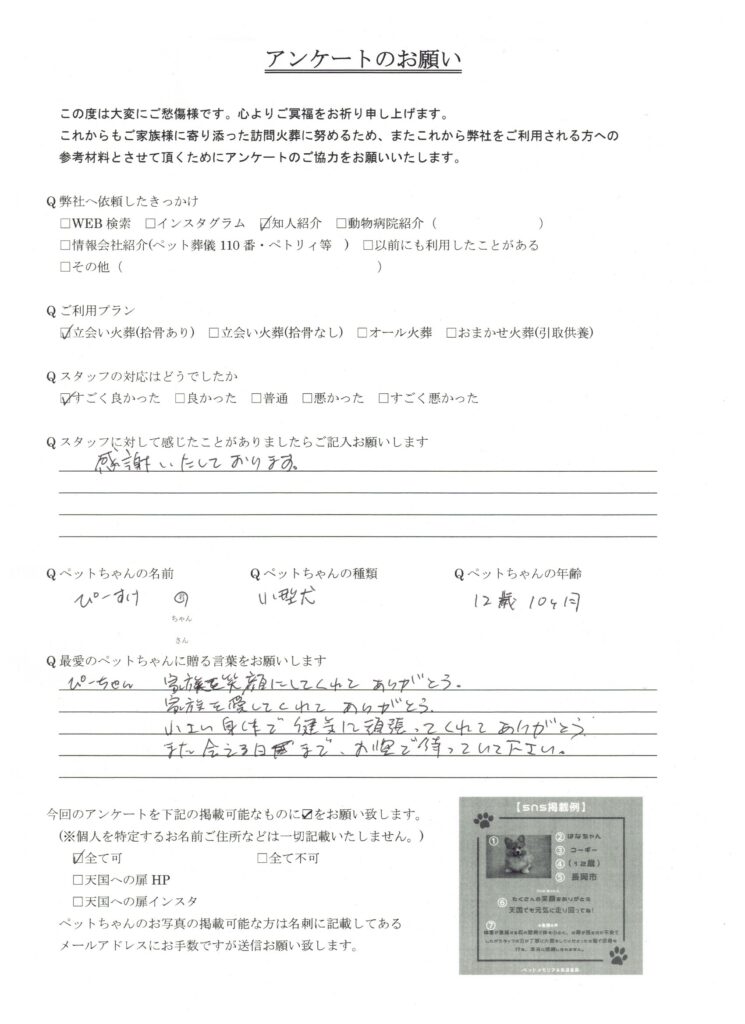 HOME > 訪問実績 > 新潟県長岡市 ぴーすけ君の葬儀 2026/04/20 投稿日:2026年4月20日 新潟県でペット葬儀を行っている「天国への扉」です。 この度は、新潟県長岡市のぴーすけ君の葬儀を行いました。 心よりご冥福をお祈り致します。 天国への扉は長岡市を中心に、完全個別火葬を行っているペット葬儀屋です。新潟県内全域に対応しております。ぜひあなたも天国への扉で愛するご家族を見送りませんか? 「ペットメモリアル新潟長岡」 Twitter Share Pocket Hatena LINE コピーする