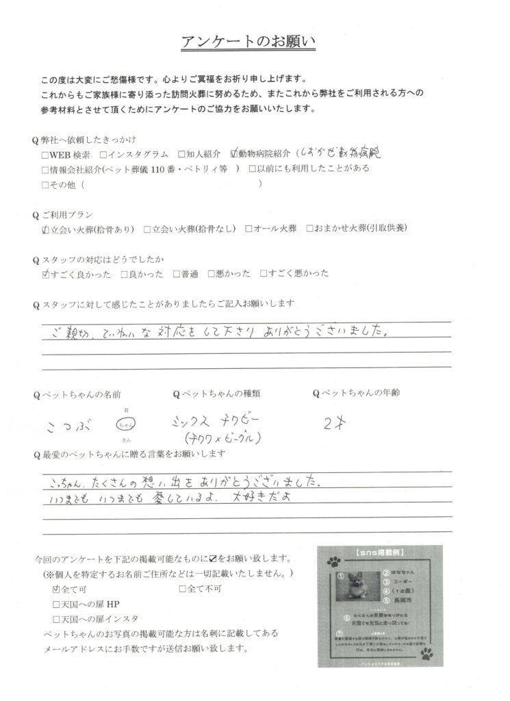 HOME > 訪問実績 > 新潟県柏崎市 こつぶちゃんの葬儀 2026/04/23 投稿日:2026年4月23日 新潟県でペット葬儀を行っている「天国への扉」です。 この度は、新潟県柏崎市のこつぶちゃんの葬儀を行いました。 心よりご冥福をお祈り致します。 天国への扉は長岡市を中心に、完全個別火葬を行っているペット葬儀屋です。新潟県内全域に対応しております。ぜひあなたも天国への扉で愛するご家族を見送りませんか? 「ペットメモリアル新潟長岡」 Twitter Share Pocket Hatena LINE コピーする